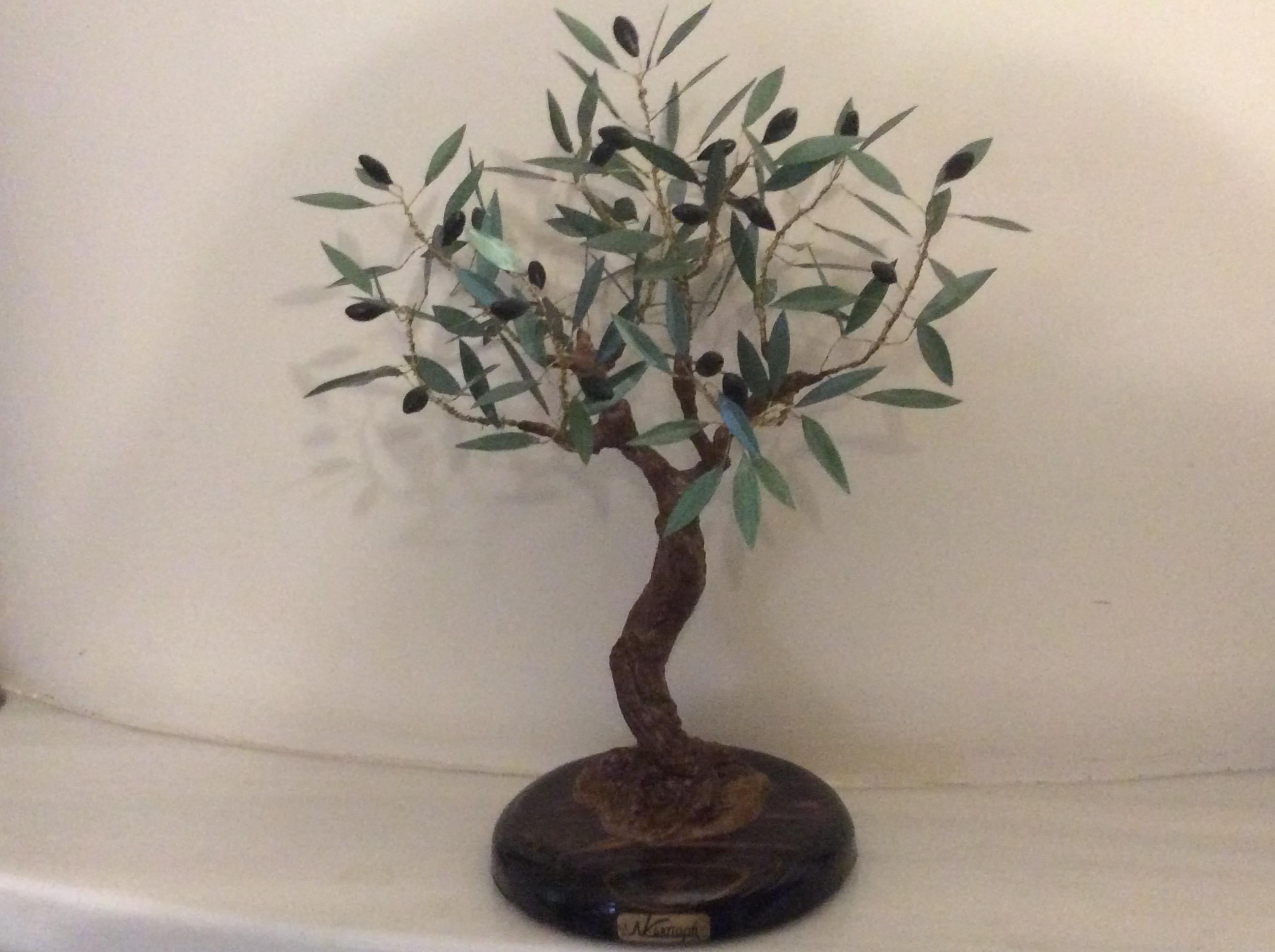 Χειροποίητο δέντρο ελιάς με μαύρους καρπούς. Είναι τοποθετημένο πάνω σε στρογγυλή ξύλινη βάση. Μοναδική χειροποίητη δημιουργία που αναπαριστά την ελιά, το ιερό και διεθνώς αναγνωρισμένο σύμβολο της σοφίας και της ειρήνης.