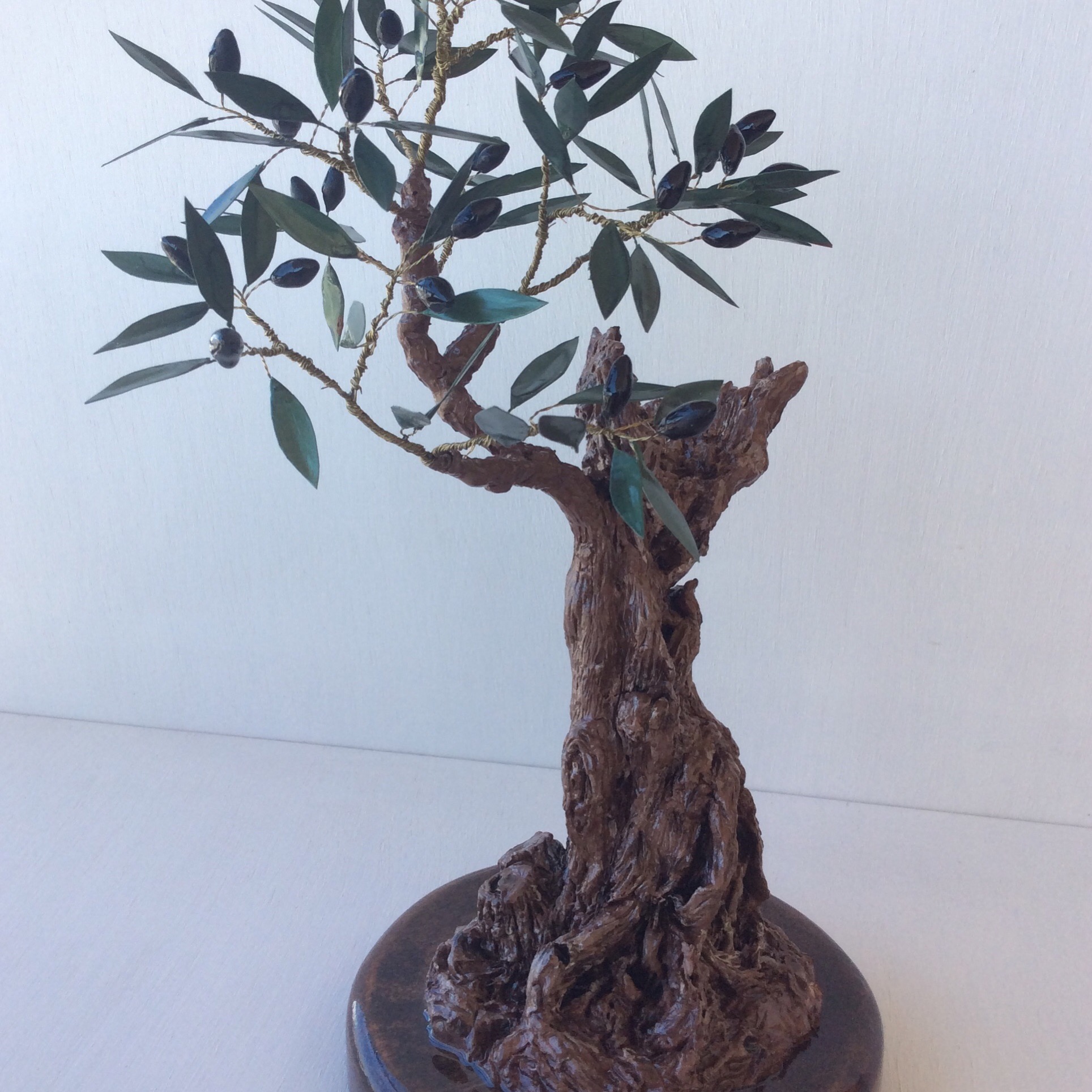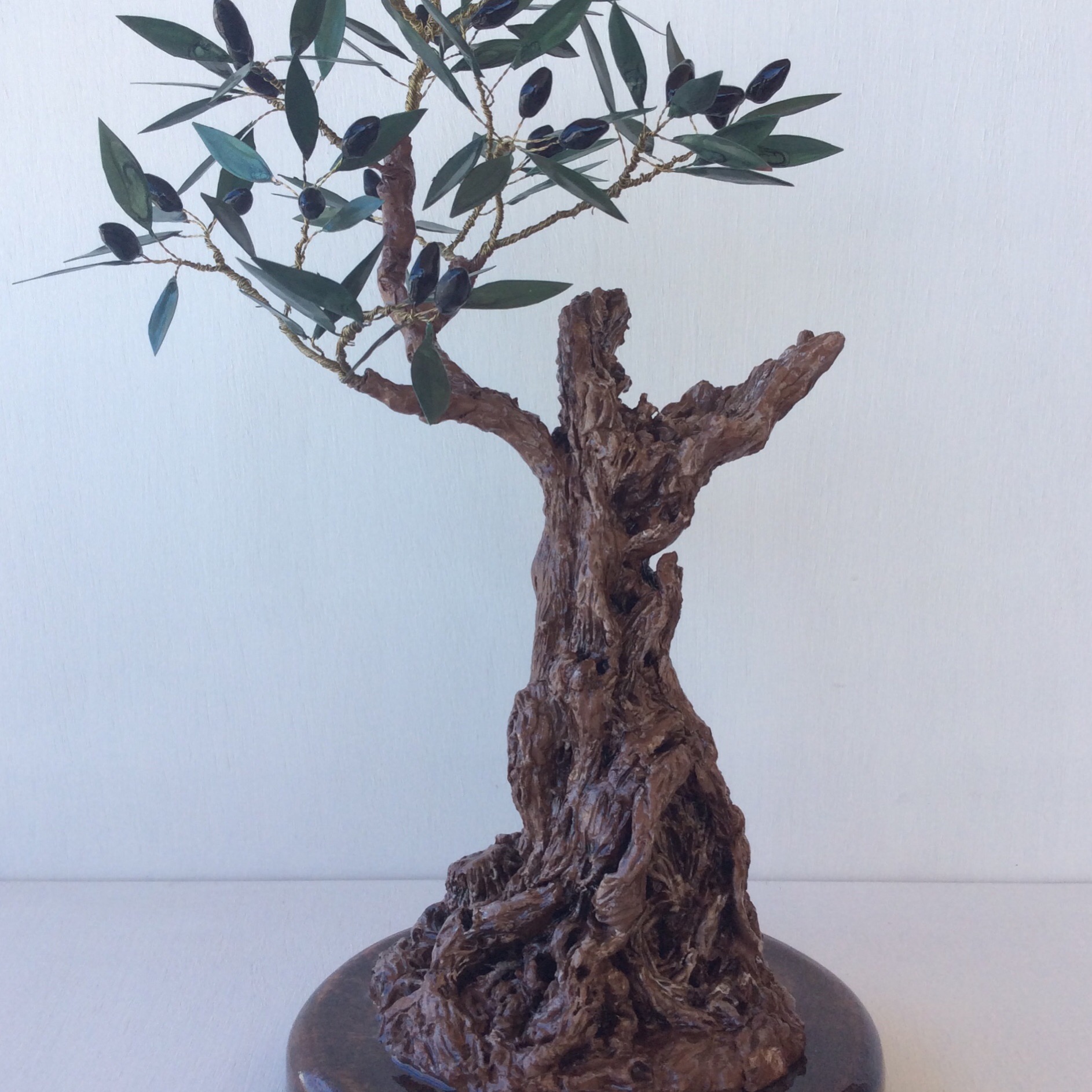 Αιωνόβιο χειροποίητο δέντρο ελιάς με μαύρους καρπούς. Είναι τοποθετημένο πάνω σε στρογγυλή ξύλινη βάση. Μοναδική χειροποίητη δημιουργία που αναπαριστά την ελιά, το ιερό και διεθνώς αναγνωρισμένο σύμβολο της σοφίας και της ειρήνης.
