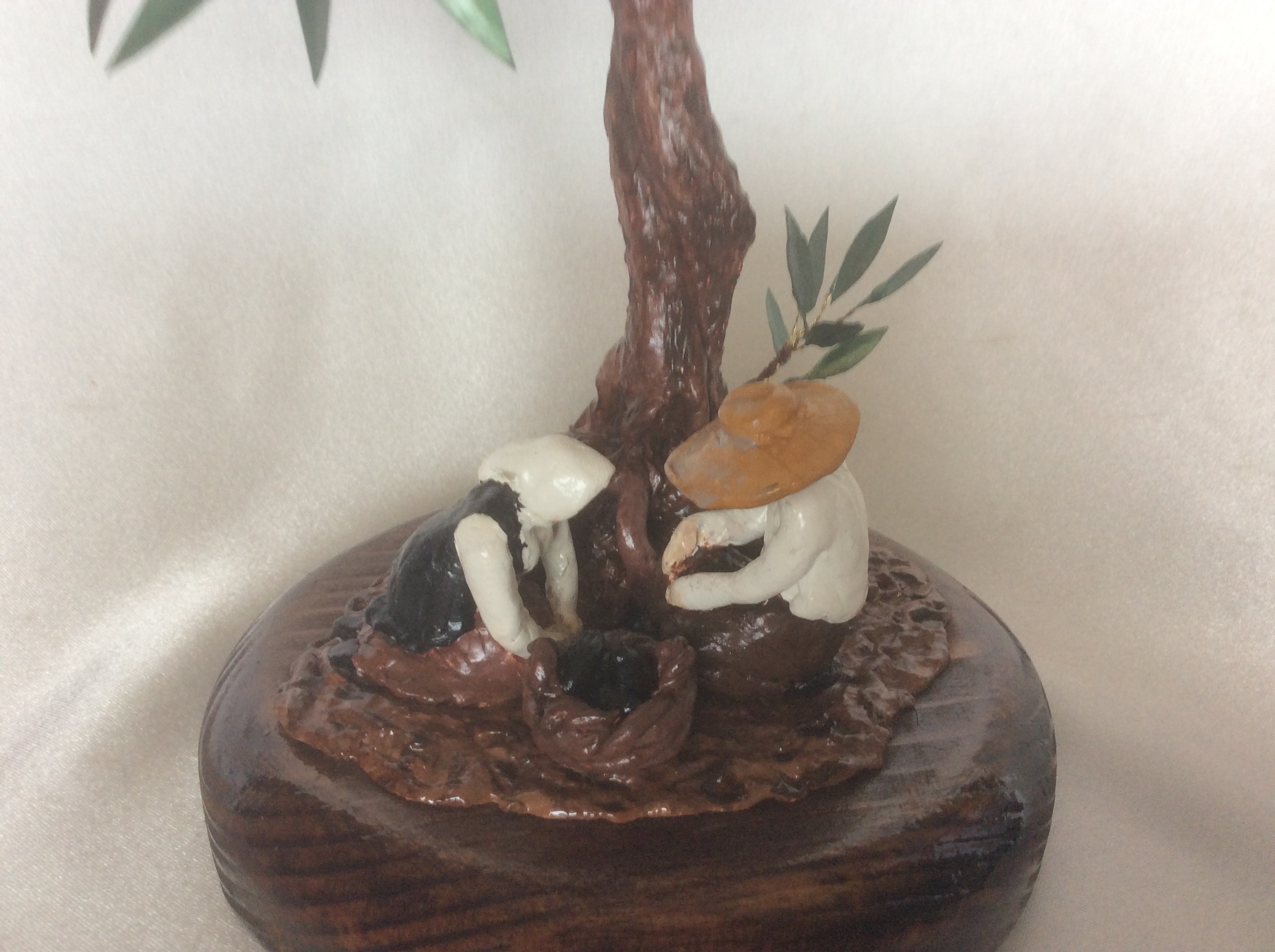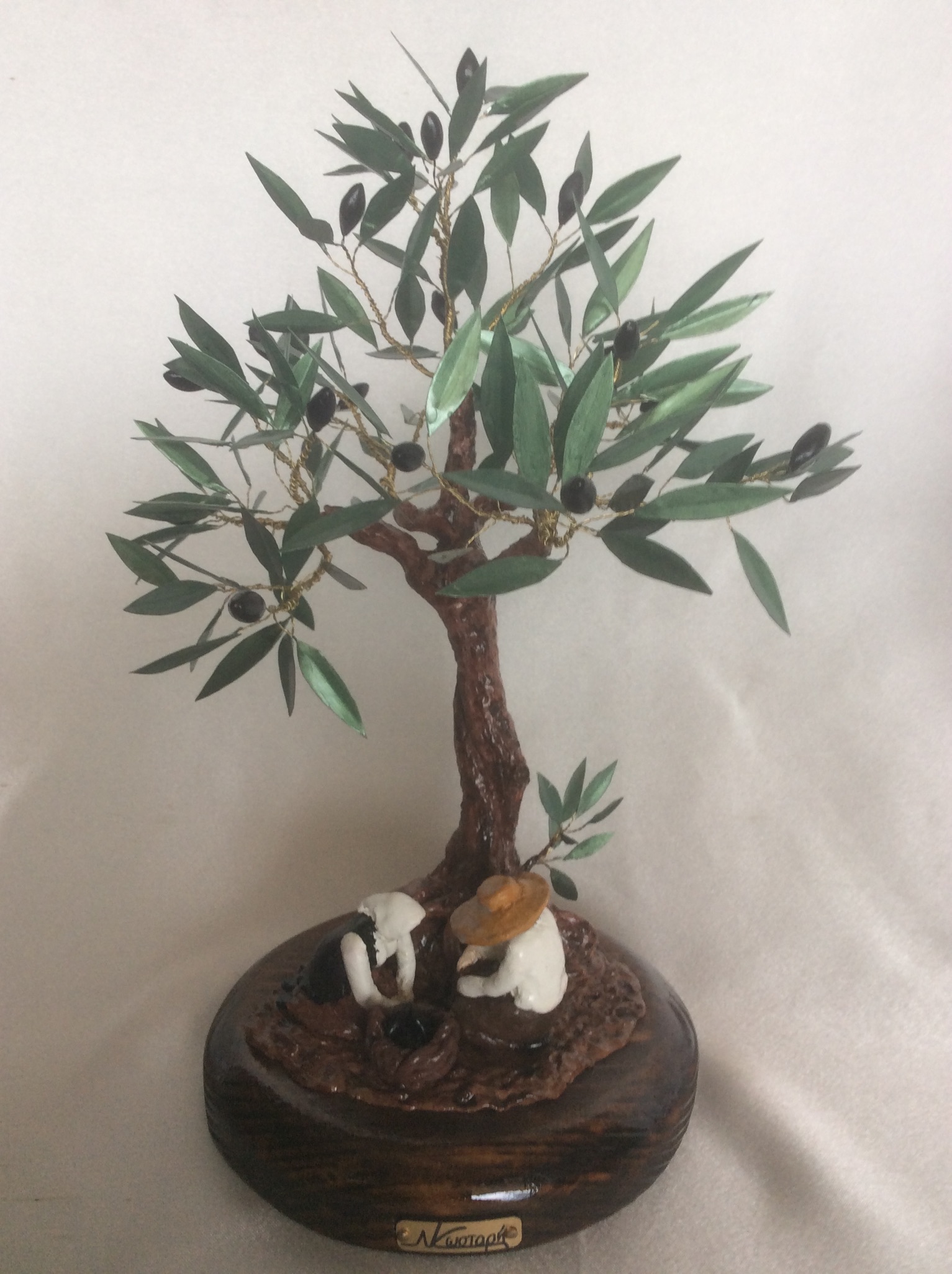 Διακοσμητικό δέντρο ελιάς με μαύρους καρπούς από πηλό. Η επισμάλτωση στα φύλλα από χαλκό δίνει φυσική όψη στην ελιά που στέκεται πάνω σε στρογγυλή ξύλινη βάση. Ο κορμός είναι δουλεμένος με πηλό και ιδιαίτερη φροντίδα στις λεπτομέρειες. Η ειδική επεξεργασία των υλικών κάνει αυτή τη μοναδική δημιουργία αναλλοίωτη στο χρόνο και αποτελεί κλασικό δώρο με διαχρονική αξία.