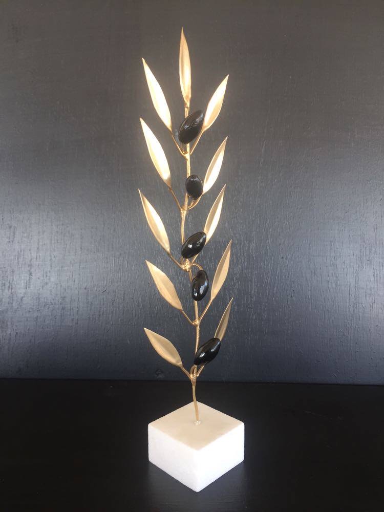 Μεγάλο διακοσμητικό κλαδί ελιάς με φύλλα σε χρυσό ή σε φυσικό χρώμα και μαύρους καρπούς. Είναι τοποθετημένο πάνω σε μαρμάρινη βάση.