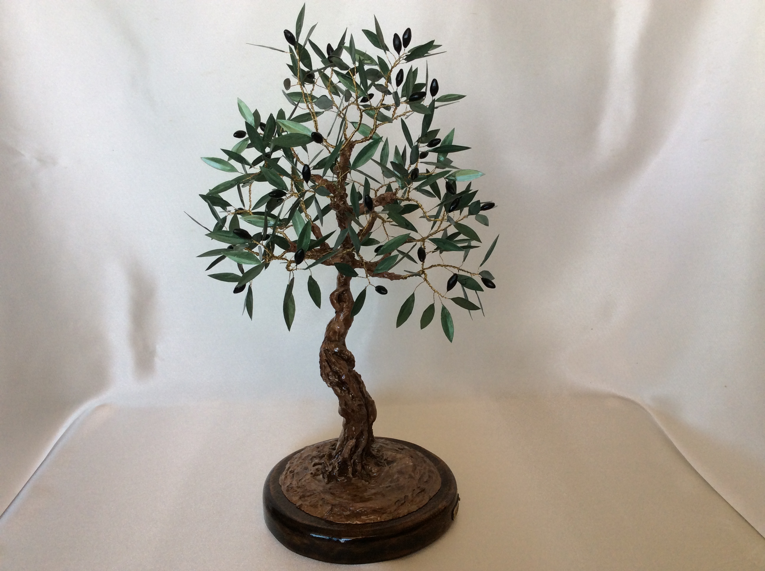 Μεγάλο διακοσμητικό δέντρο ελιάς με μαύρους καρπούς από πηλό. Η επισμάλτωση στα φύλλα από χαλκό δίνει φυσική όψη στην ελιά που στέκεται πάνω σε στρόγγυλη ξύλινη βάση. Ο κορμός είναι γλυπτός με ιδιαίτερη φροντίδα στις λεπτομέρειες. Μοναδική χειροποίητη δημιουργία που αναπαριστά την ελιά, το ιερό και διεθνώς αναγνωρισμένο σύμβολο της ειρήνης και της ελπίδας. Ένα μοναδικό διακοσμητικό δέντρο ελιάς, κλασσικό δώρο με έντονο συμβολισμό και διαχρονική αξία ιδανικό και για διακόσμηση γραφείου ή επαγγελματικού χώρου.