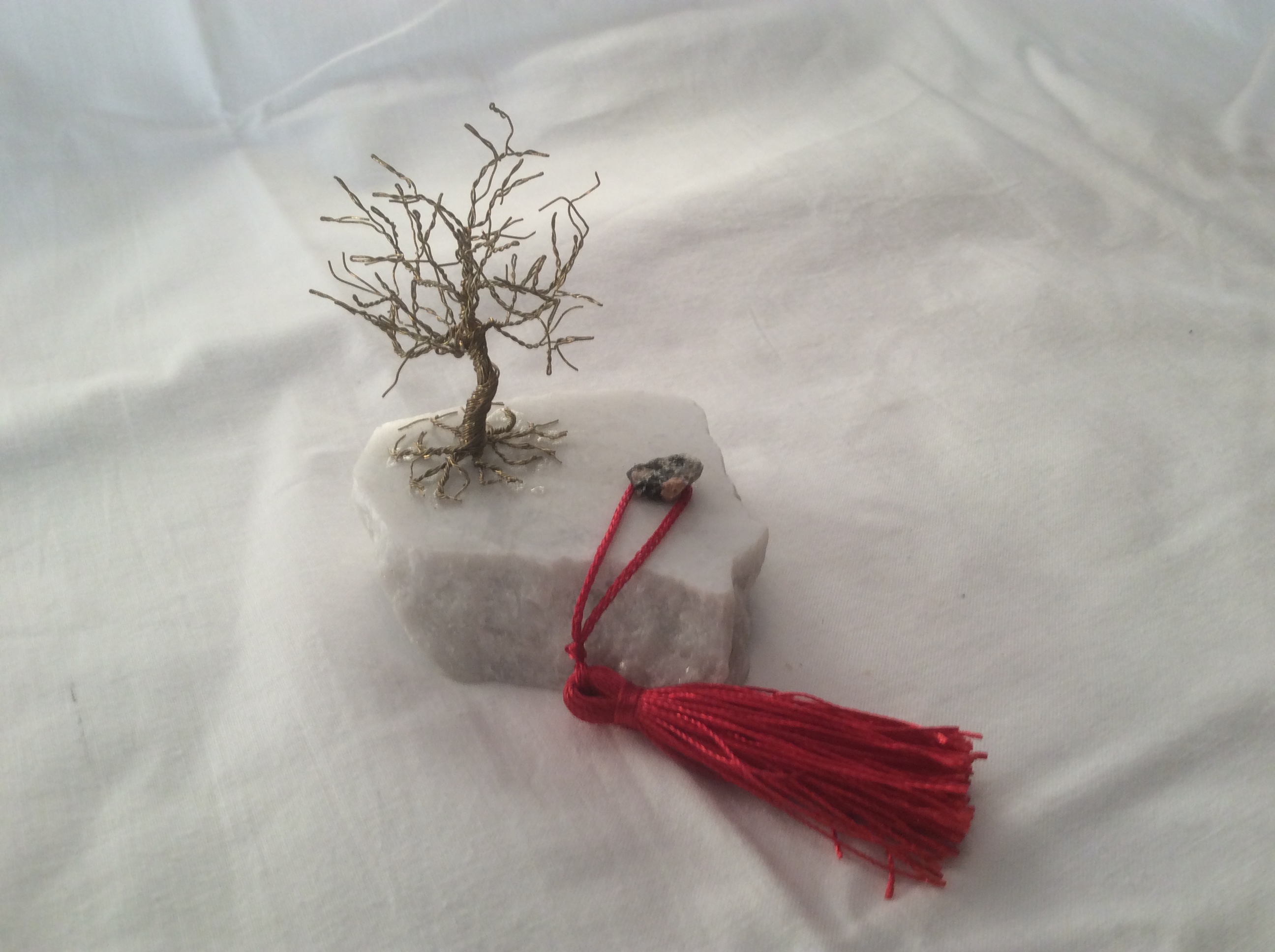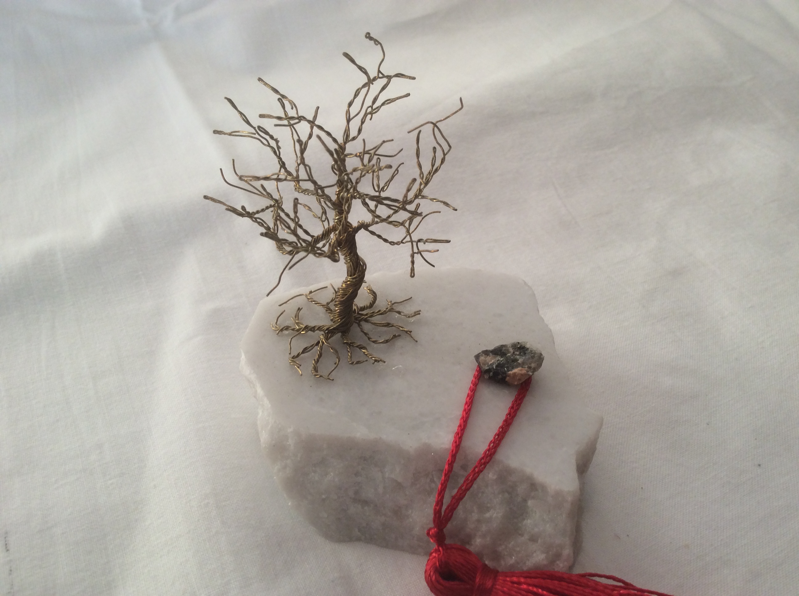 Δέντρο μινιατούρα απο ορείχαλκο πάνω σε μάρμαρο. Στη βάση υπάρχει μικρό κόκκινο φουντάκι. Η ρίζα απλώνεται πάνω στο μάρμαρο.