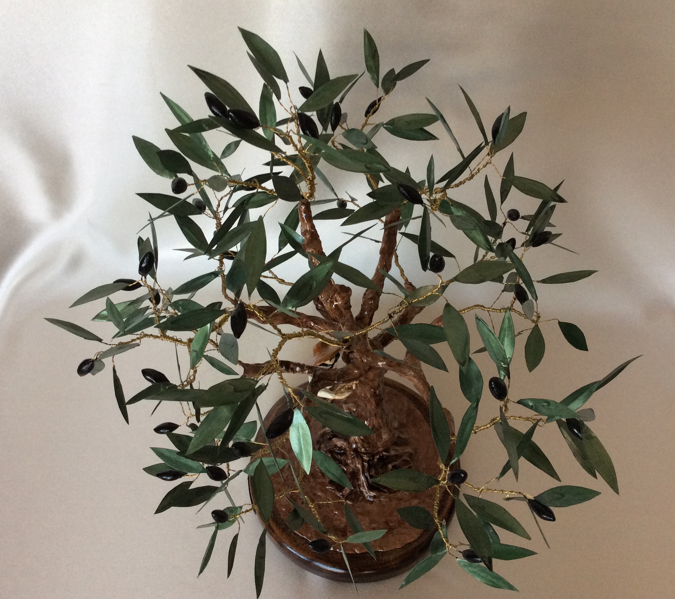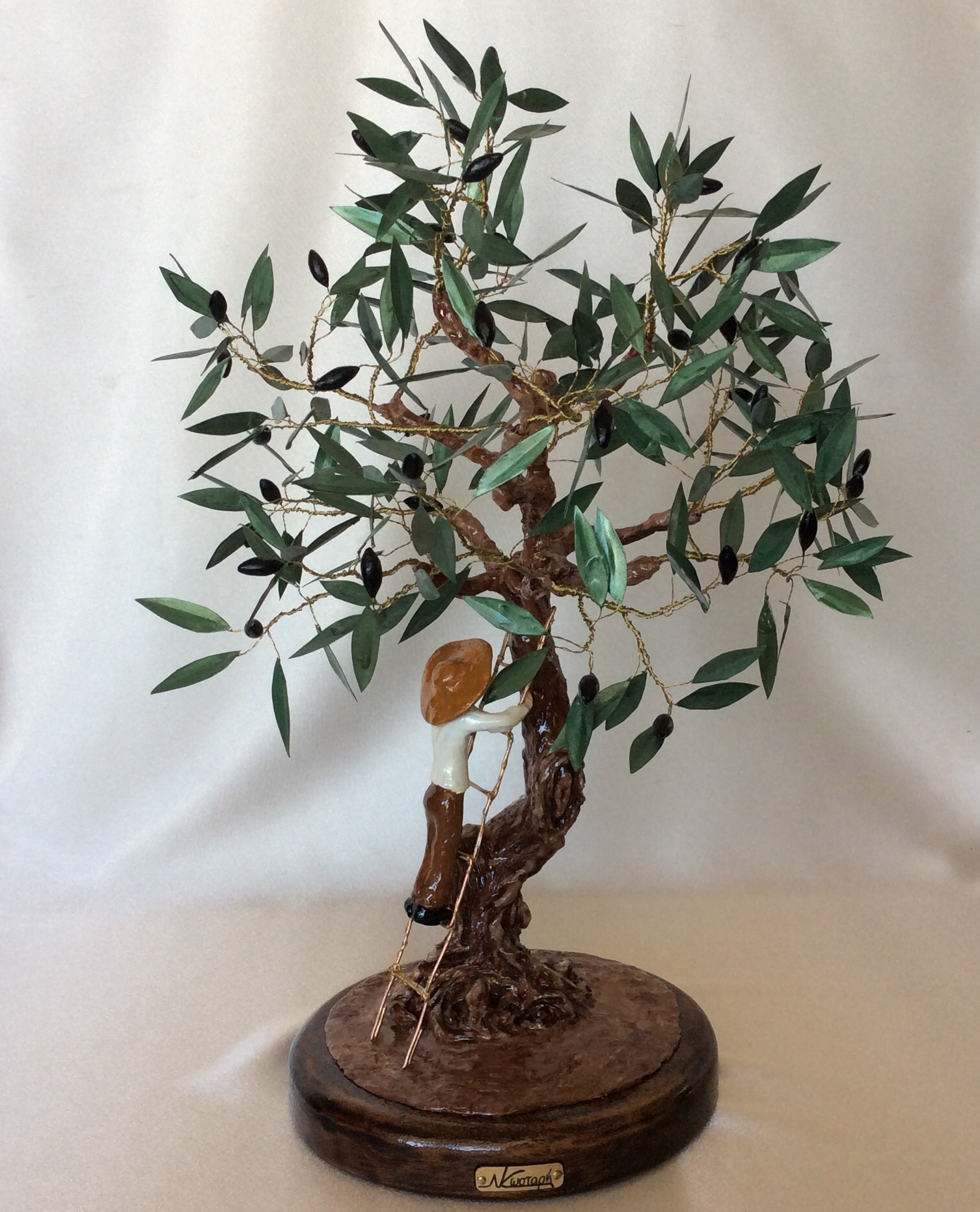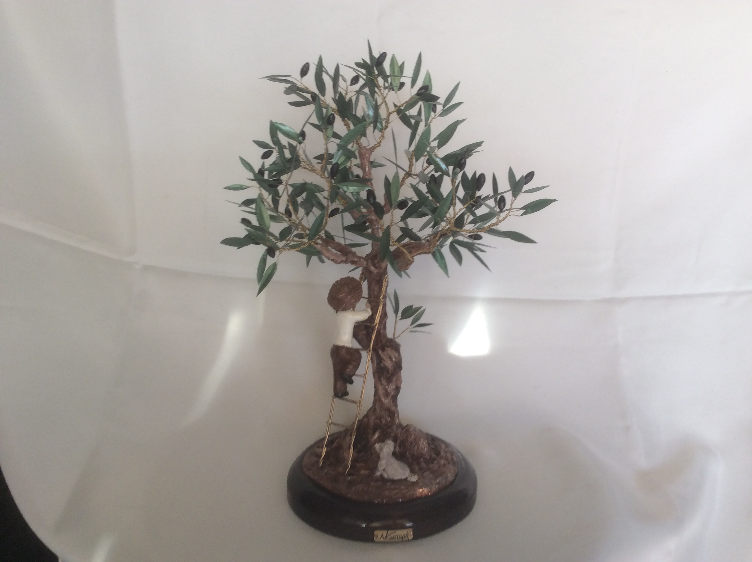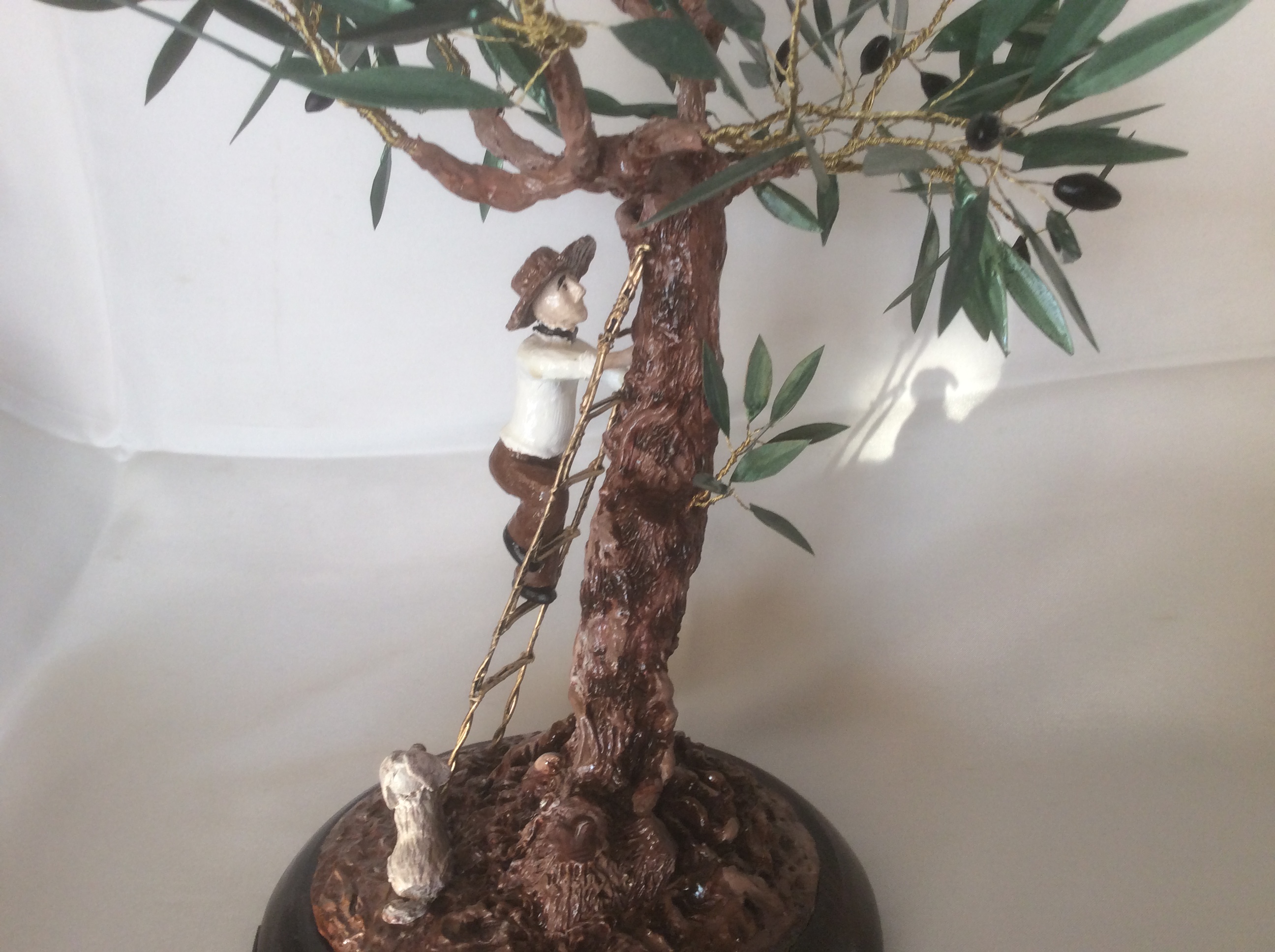 Μεγάλο διακοσμητικό δέντρο ελιάς με μαύρους καρπούς από πηλό. Η επισμάλτωση στα φύλλα από χαλκό δίνει φυσική όψη στην ελιά που στέκεται πάνω σε στρόγγυλη ξύλινη βάση. Ο κορμός είναι γλυπτός δουλεμένος με ιδιαίτερη φροντίδα στις λεπτομέρειες. Ο άντρας και ο σκύλος είναι επίσης γλυπτά με μεγάλη λεπτομέρεια. Η ειδική επεξεργασία των υλικών κάνει αυτή τη μοναδική δημιουργία αναλλοίωτη στο χρόνο και αποτελεί κλασσικό δώρο με διαχρονική αξία.