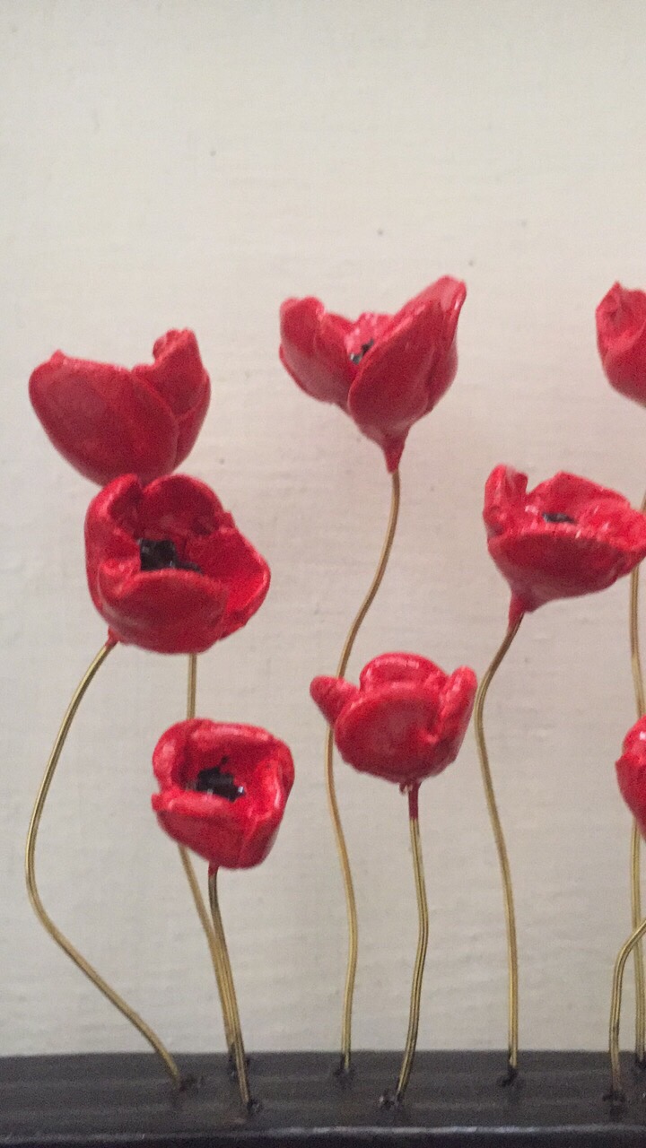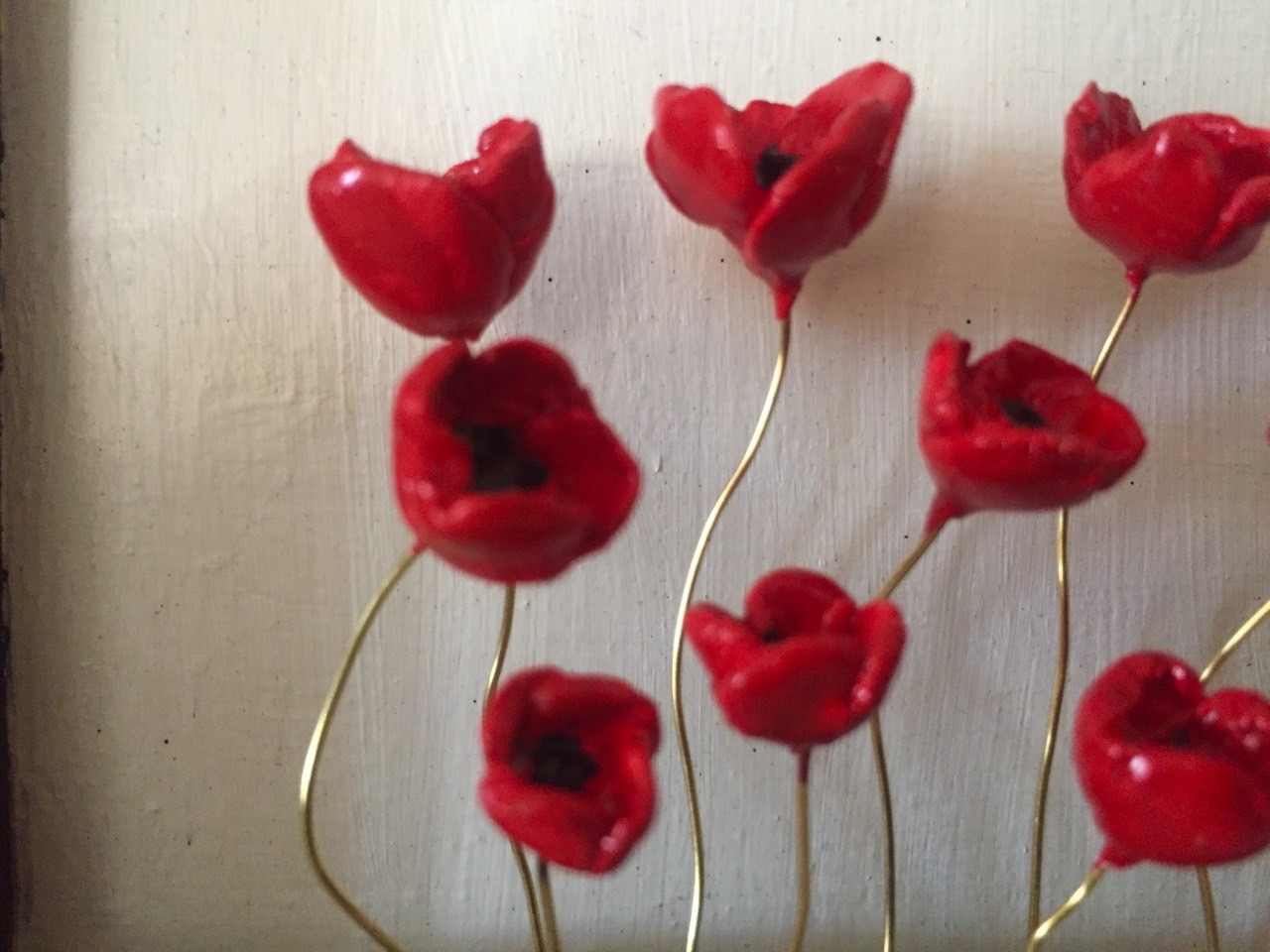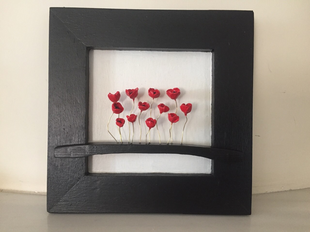 Κατακόκκινες παπαρούνες από πηλό βαμμένες μια μια στο χέρι και μίσχο από ορείχαλκο. Το κάδρο είναι ξύλινο βαμμένο ματ άσπρο μαύρο . Ένα πολύ καλαίσθητο κάδρο που μπορεί να σταθεί σε κάθε χώρο δίνοντας χρώμα και αισιοδοξία .