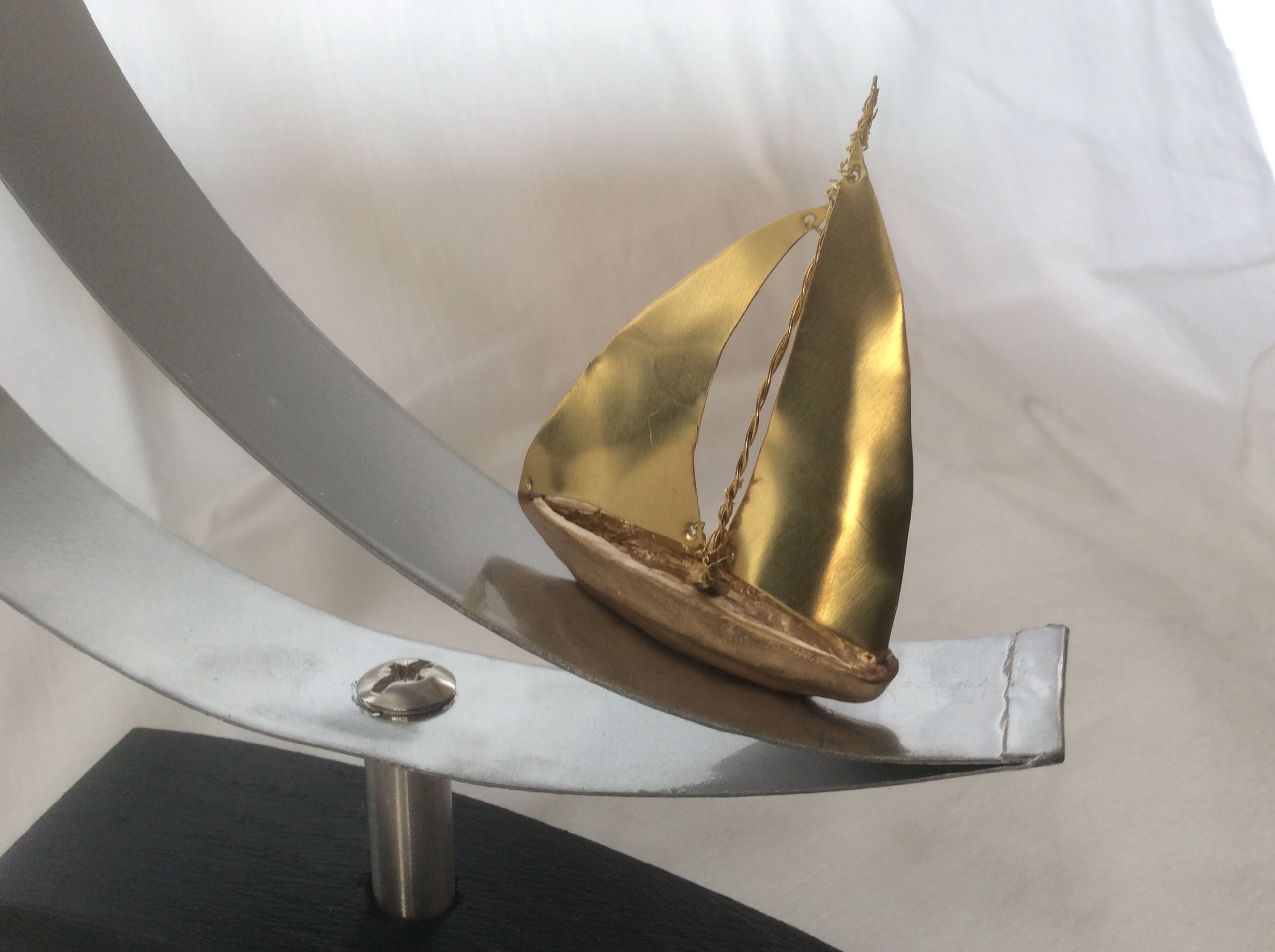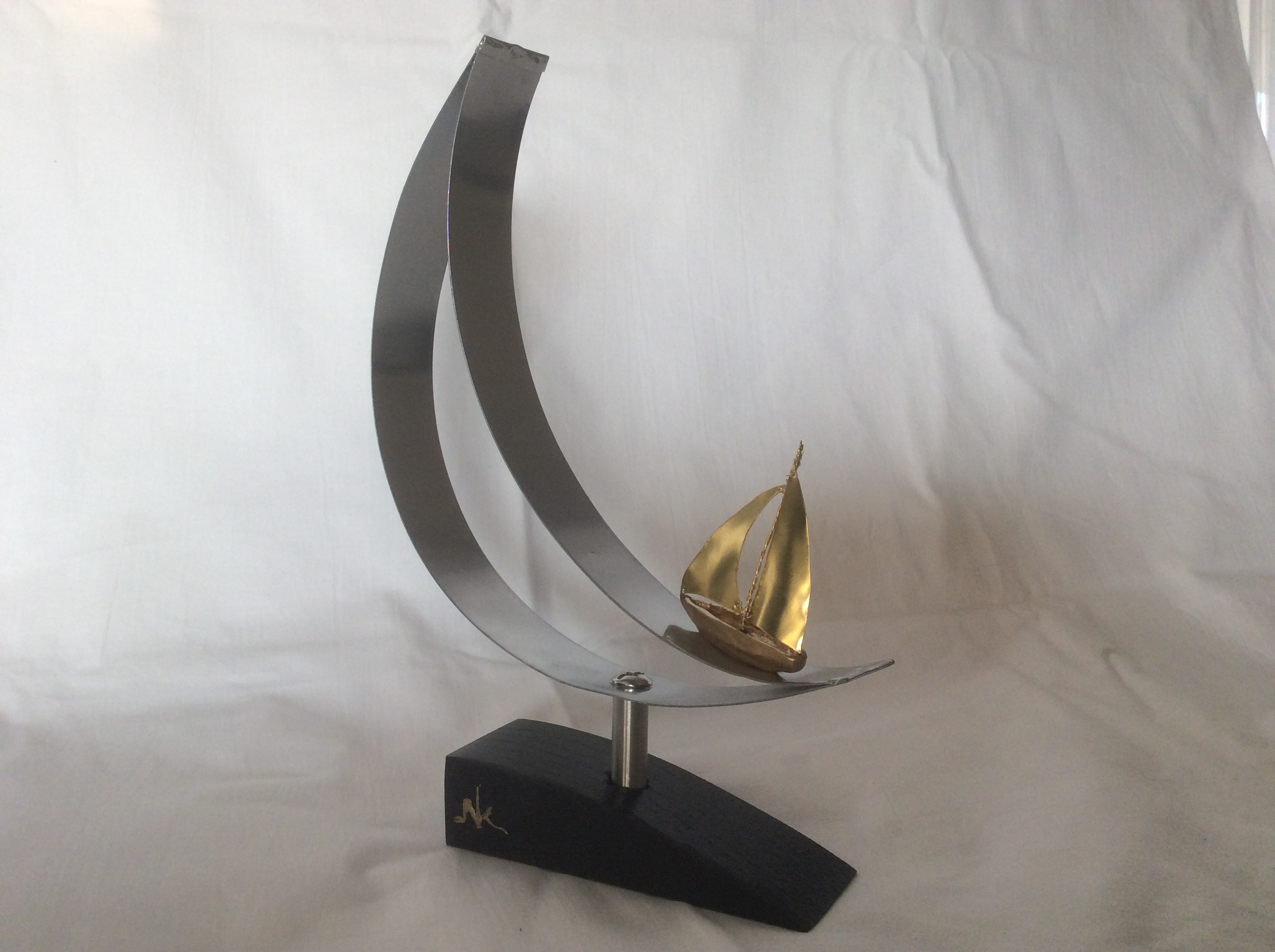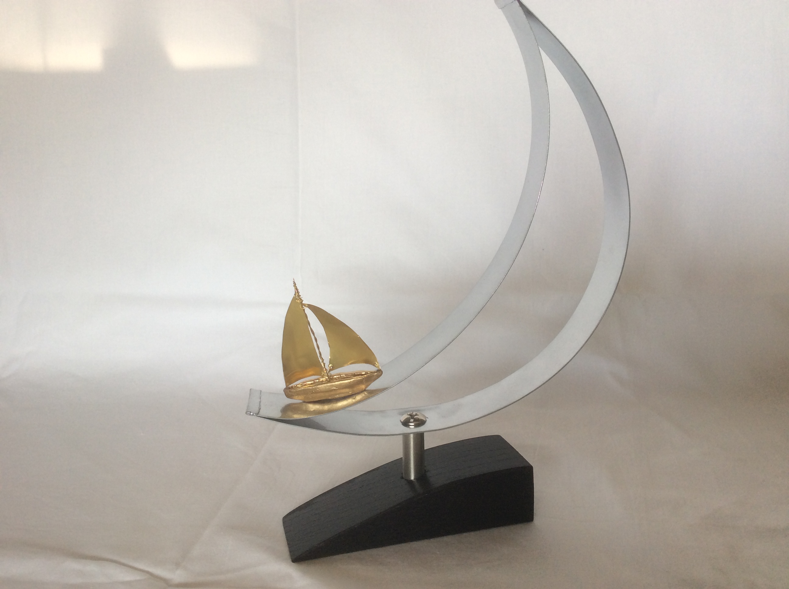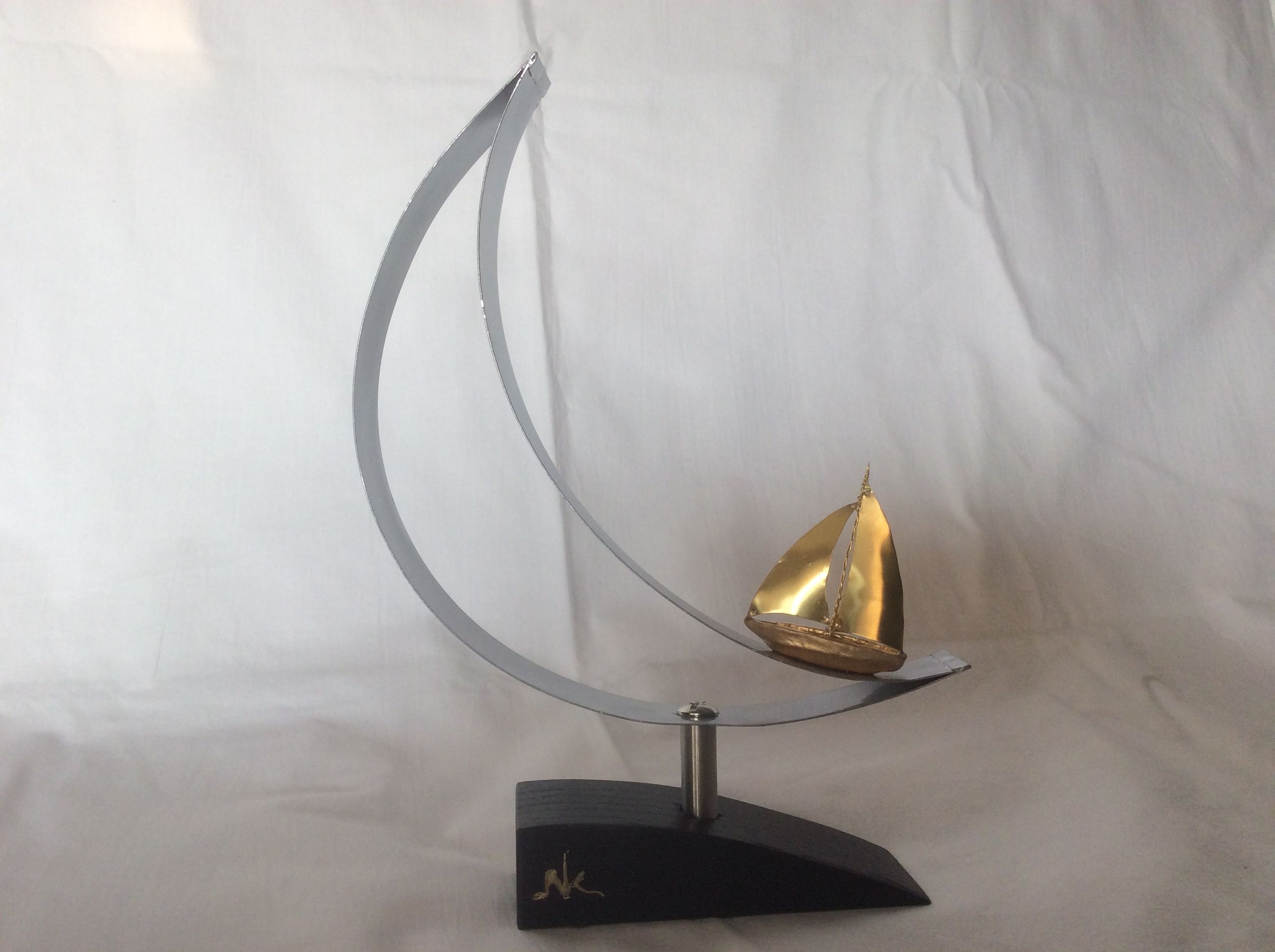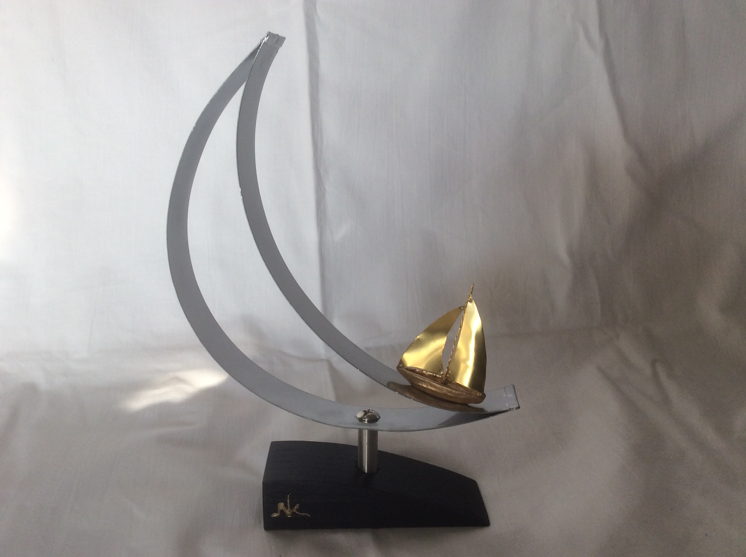 Χρυσή βάρκα από πηλό με ορειχάλκινα πανιά που αρμενίζει πάνω σε μεταλλικό φεγγάρι.