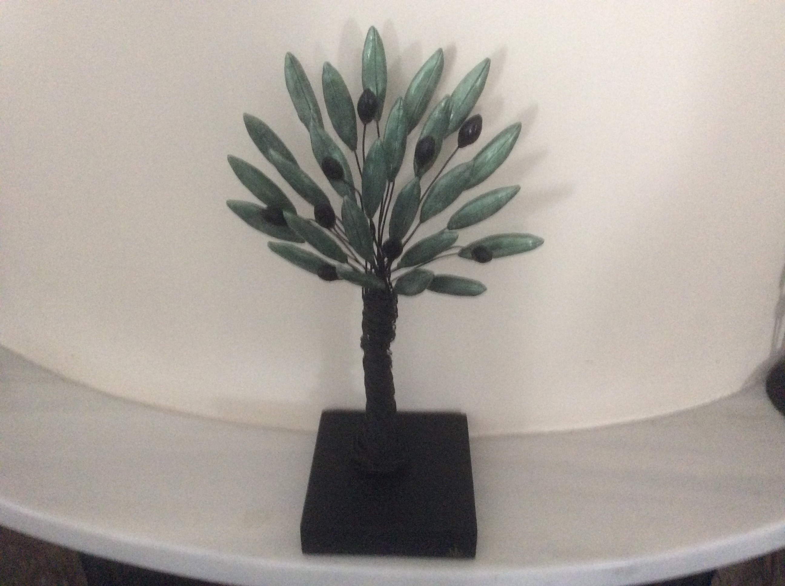 Μεγάλο διακοσμητικό δέντρο ελιάς με μαύρους καρπούς και φύλλα από πηλό. Η επισμάλτωση στα φύλλα δίνει φυσική όψη στην ελιά. Οι μίσχοι των φύλλων και ο κορμός είναι από μαύρο σύρμα κατάλληλα δουλεμένο για να δώσει μια μοντέρνα όψη στο διεθνώς αναγνωρισμένο σύμβολο της ειρήνης και της ελπίδας.