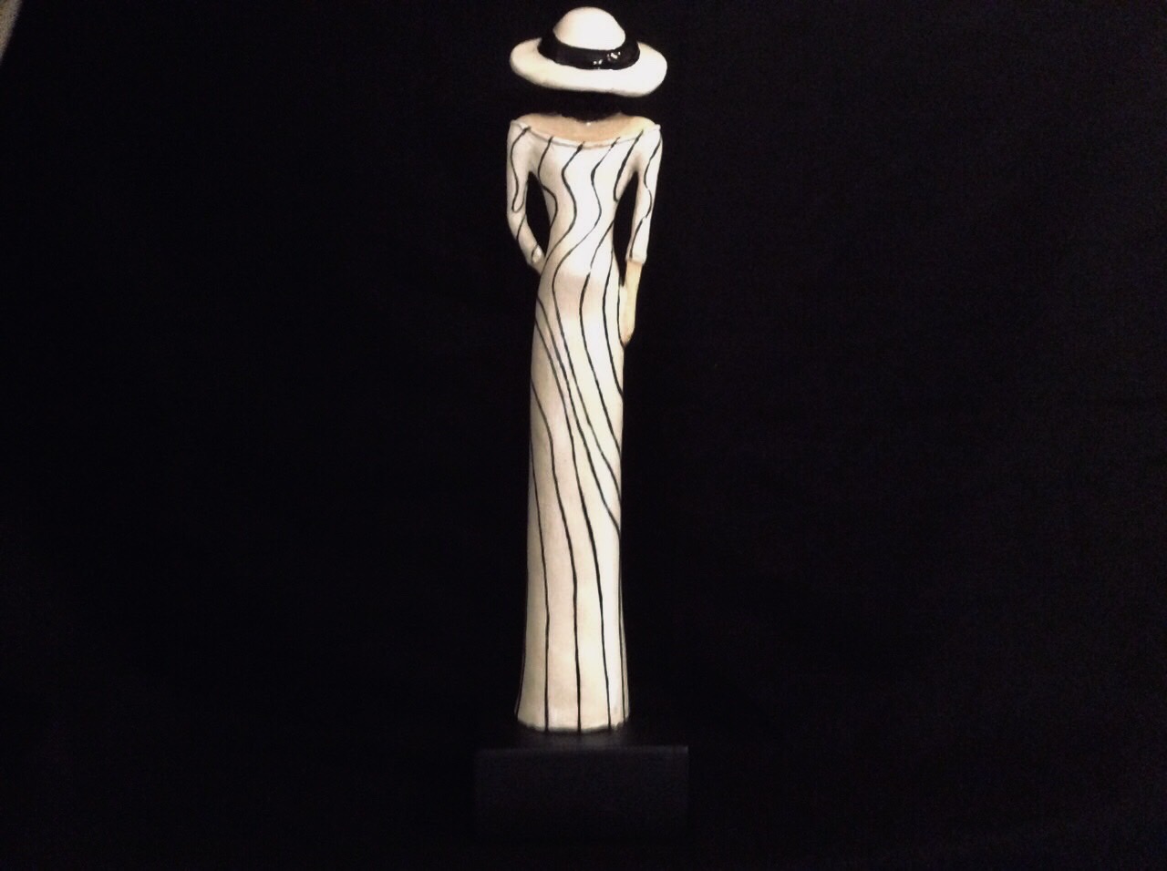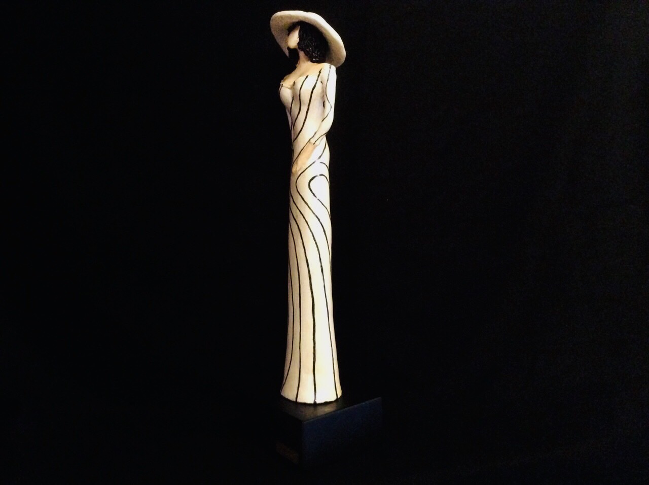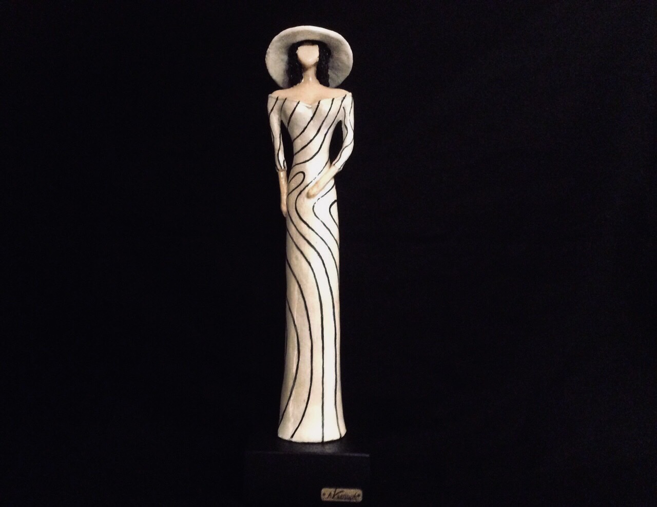 Μοναδικό χειροποίητο γλυπτό. Μια γυναικεία φιγούρα με μακρύ εντυπωσιακό φόρεμα και καπέλο, εμπνευσμένο από τη Γαλλική κουλτούρα. Ένα μοντέρνο χειροποίητο, μοναδικό γλυπτό που θα δώσει στο χώρο σας τον αέρα της Γαλλικής φινέτσας. Είναι φτιαγμένο με ιδιαίτερη φροντίδα στις λεπτομέρειες από πηλό. Είναι βαμμένη με σμάλτο και ειδικό βερνίκι για να μείνει αναλλοίωτη στο χρόνο. Τοποθετημένη πάνω σε μαύρη ξύλινη βάση.