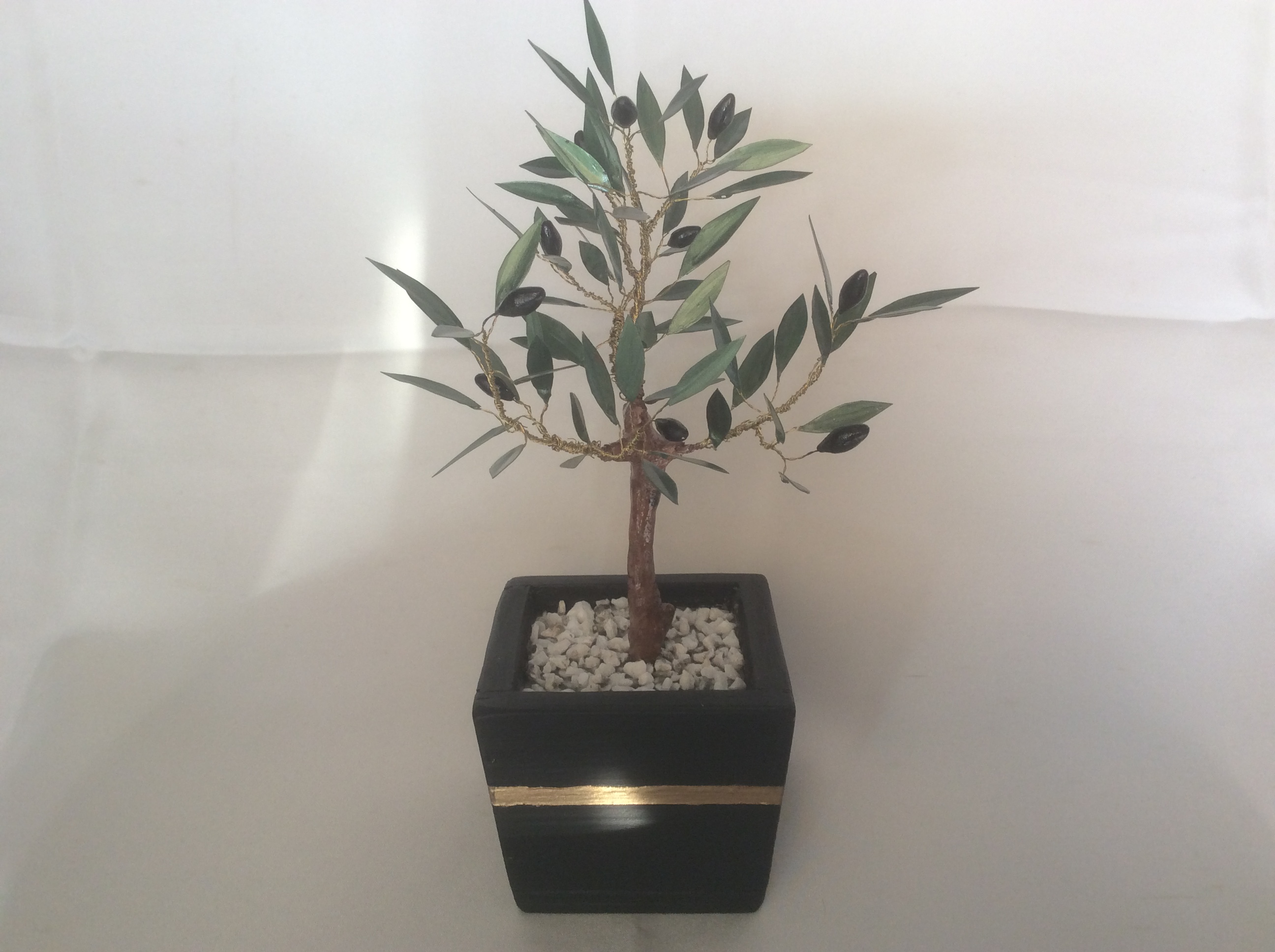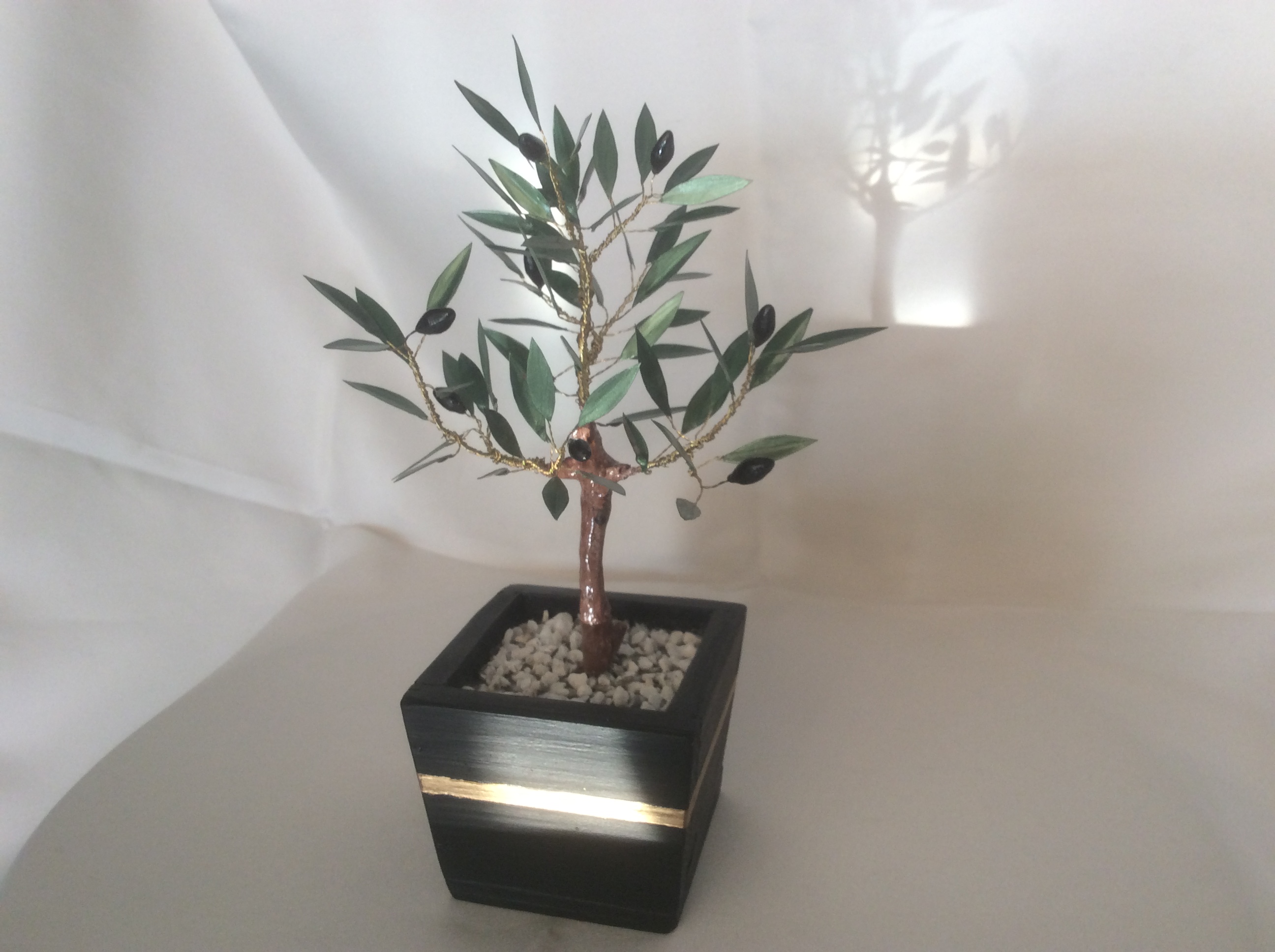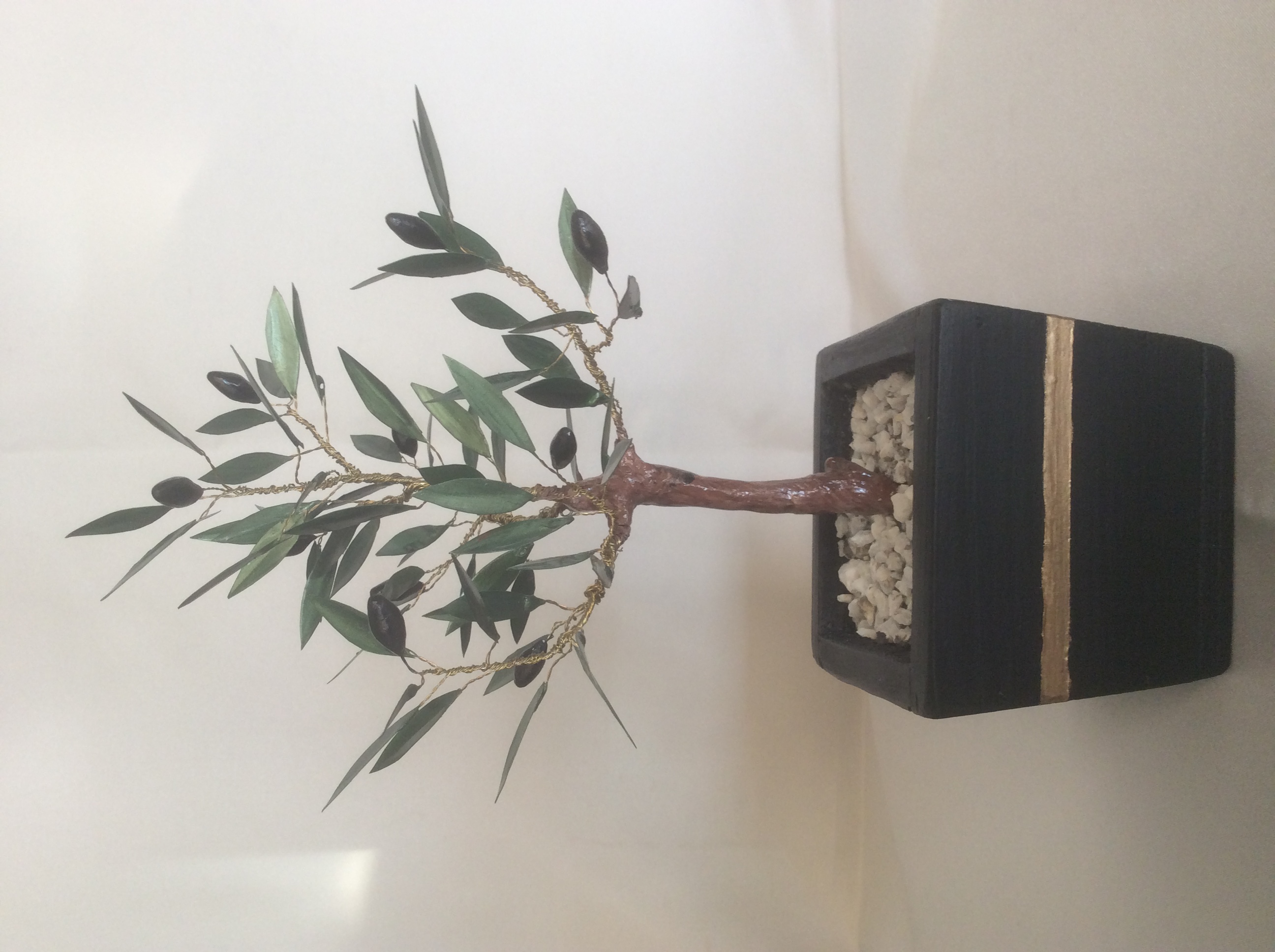 Ένα πανέμορφο μικρογλυπτό με δέντρο ελιάς τοποθετημένο σε μικρό γλαστράκι με λευκά βότσαλα.