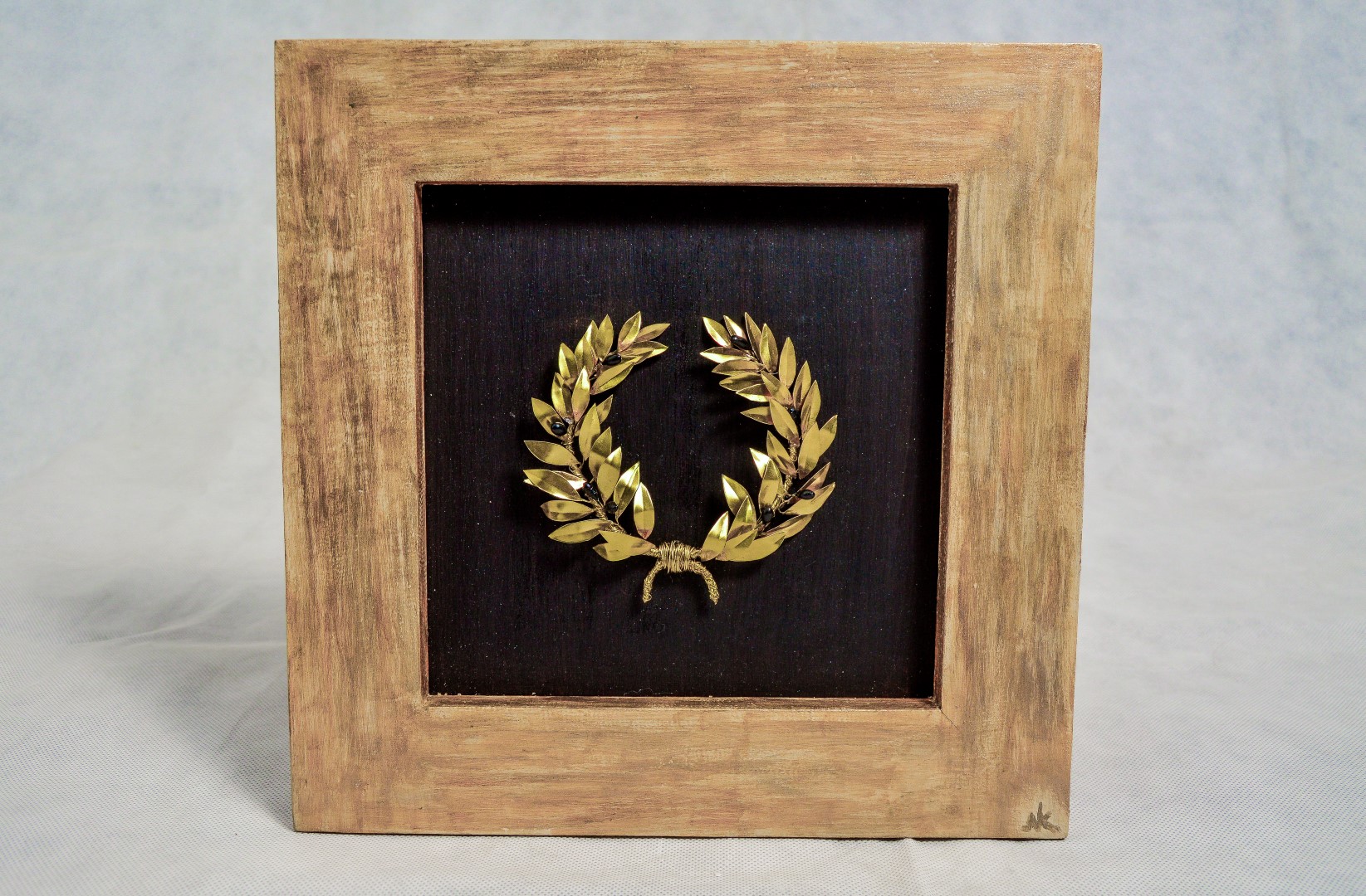 Μικρό χειροποίητο στεφάνι ελιάς με μαύρους καρπούς από πηλό σε κάδρο.Το χρώμα της κορνίζας εναρμονίζεται τέλεια με το ορειχάλκινο στεφάνι.