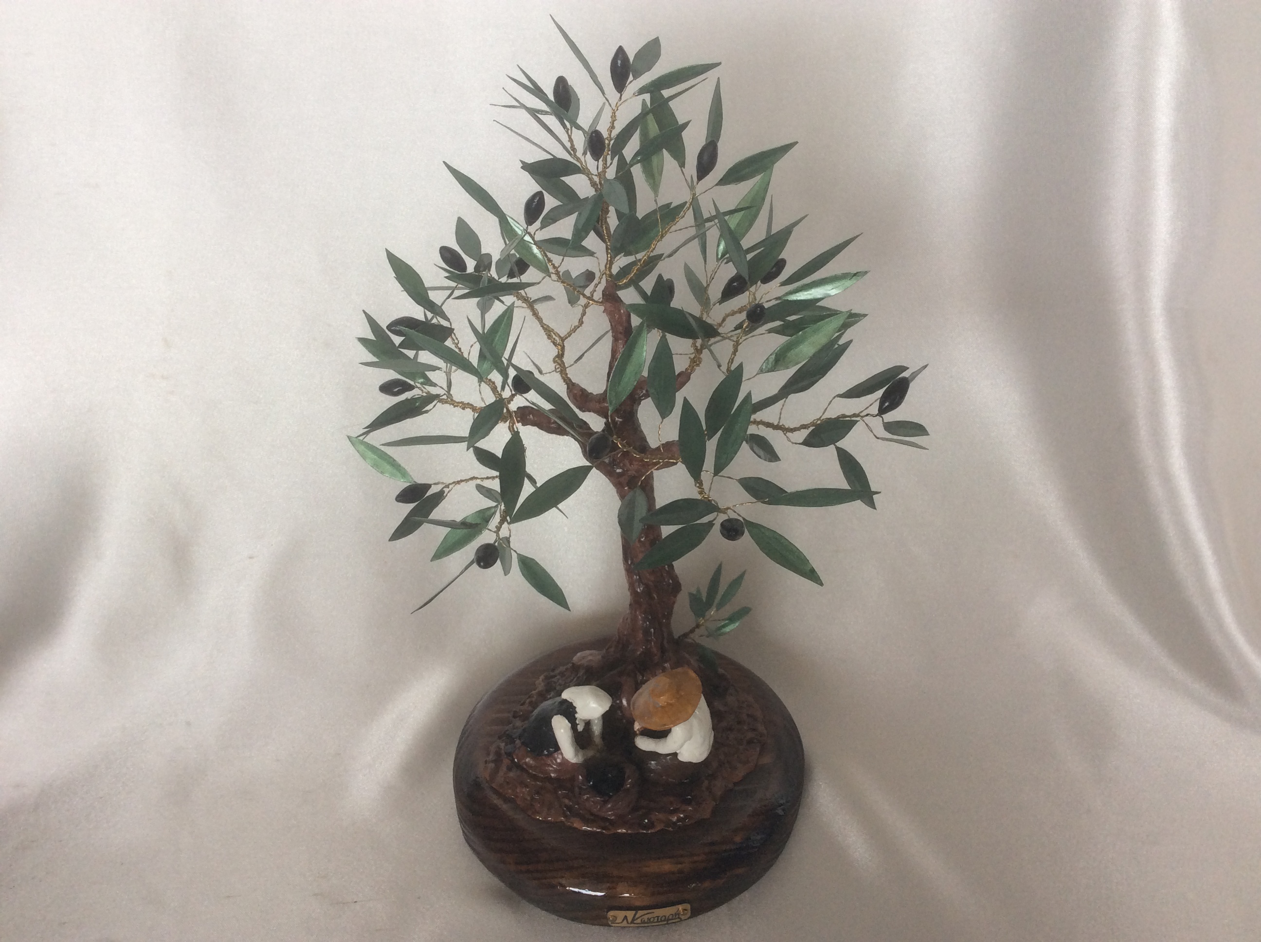 Διακοσμητικό δέντρο ελιάς με μαύρους καρπούς από πηλό. Η επισμάλτωση στα φύλλα από χαλκό δίνει φυσική όψη στην ελιά που στέκεται πάνω σε στρογγυλή ξύλινη βάση. Ο κορμός είναι δουλεμένος με πηλό και ιδιαίτερη φροντίδα στις λεπτομέρειες. Η ειδική επεξεργασία των υλικών κάνει αυτή τη μοναδική δημιουργία αναλλοίωτη στο χρόνο και αποτελεί κλασικό δώρο με διαχρονική αξία.