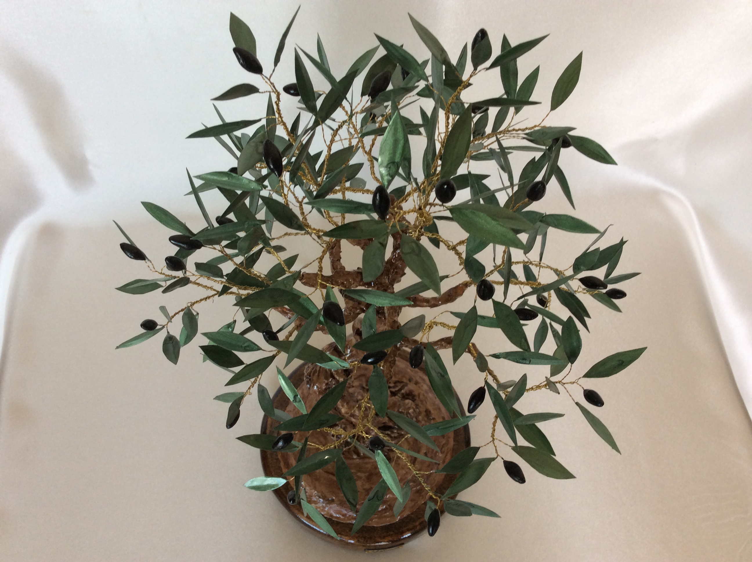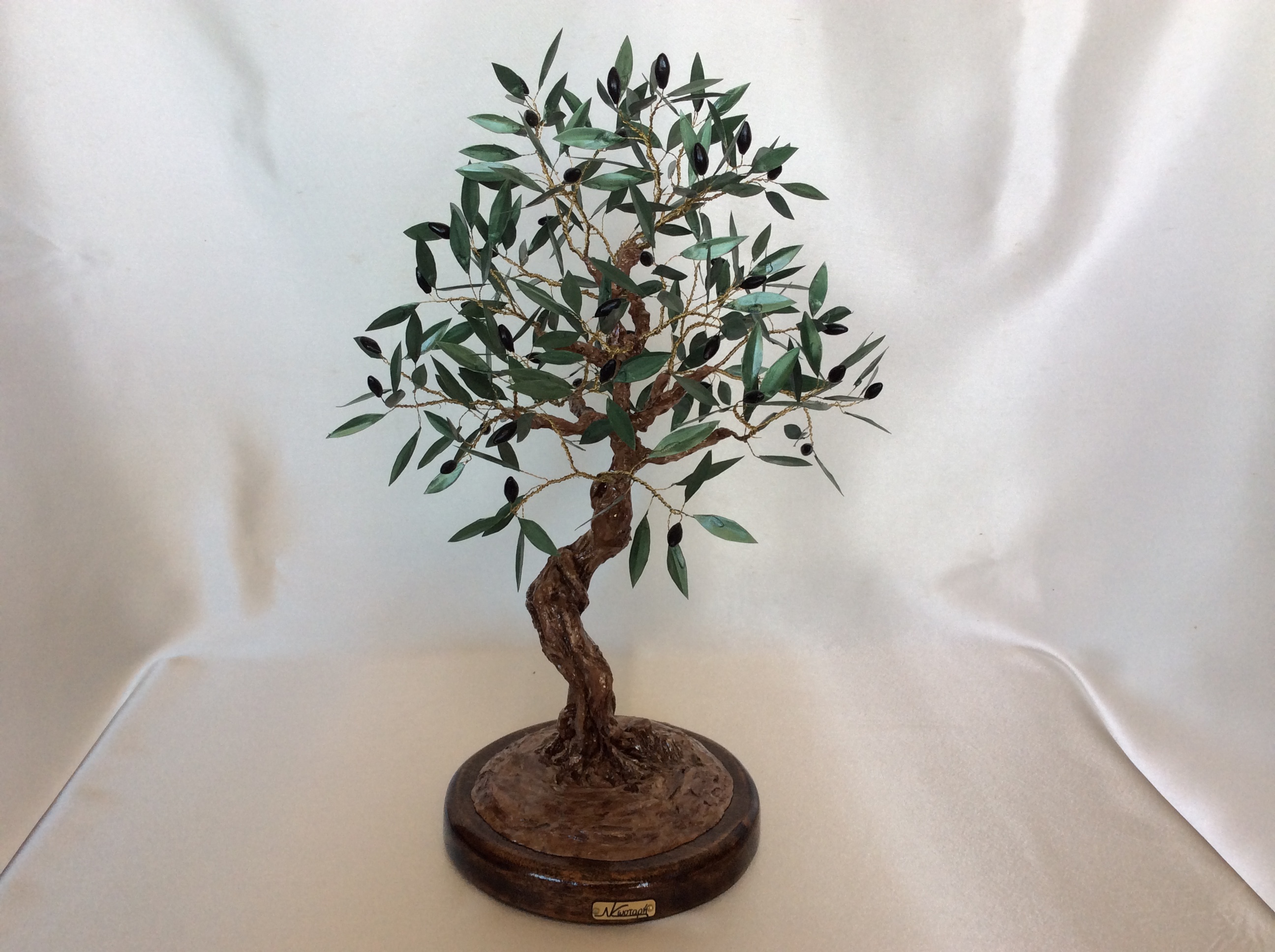 Μεγάλο διακοσμητικό δέντρο ελιάς με μαύρους καρπούς από πηλό. Η επισμάλτωση στα φύλλα από χαλκό δίνει φυσική όψη στην ελιά που στέκεται πάνω σε στρόγγυλη ξύλινη βάση. Ο κορμός είναι γλυπτός με ιδιαίτερη φροντίδα στις λεπτομέρειες. Μοναδική χειροποίητη δημιουργία που αναπαριστά την ελιά, το ιερό και διεθνώς αναγνωρισμένο σύμβολο της ειρήνης και της ελπίδας. Ένα μοναδικό διακοσμητικό δέντρο ελιάς, κλασσικό δώρο με έντονο συμβολισμό και διαχρονική αξία ιδανικό και για διακόσμηση γραφείου ή επαγγελματικού χώρου.