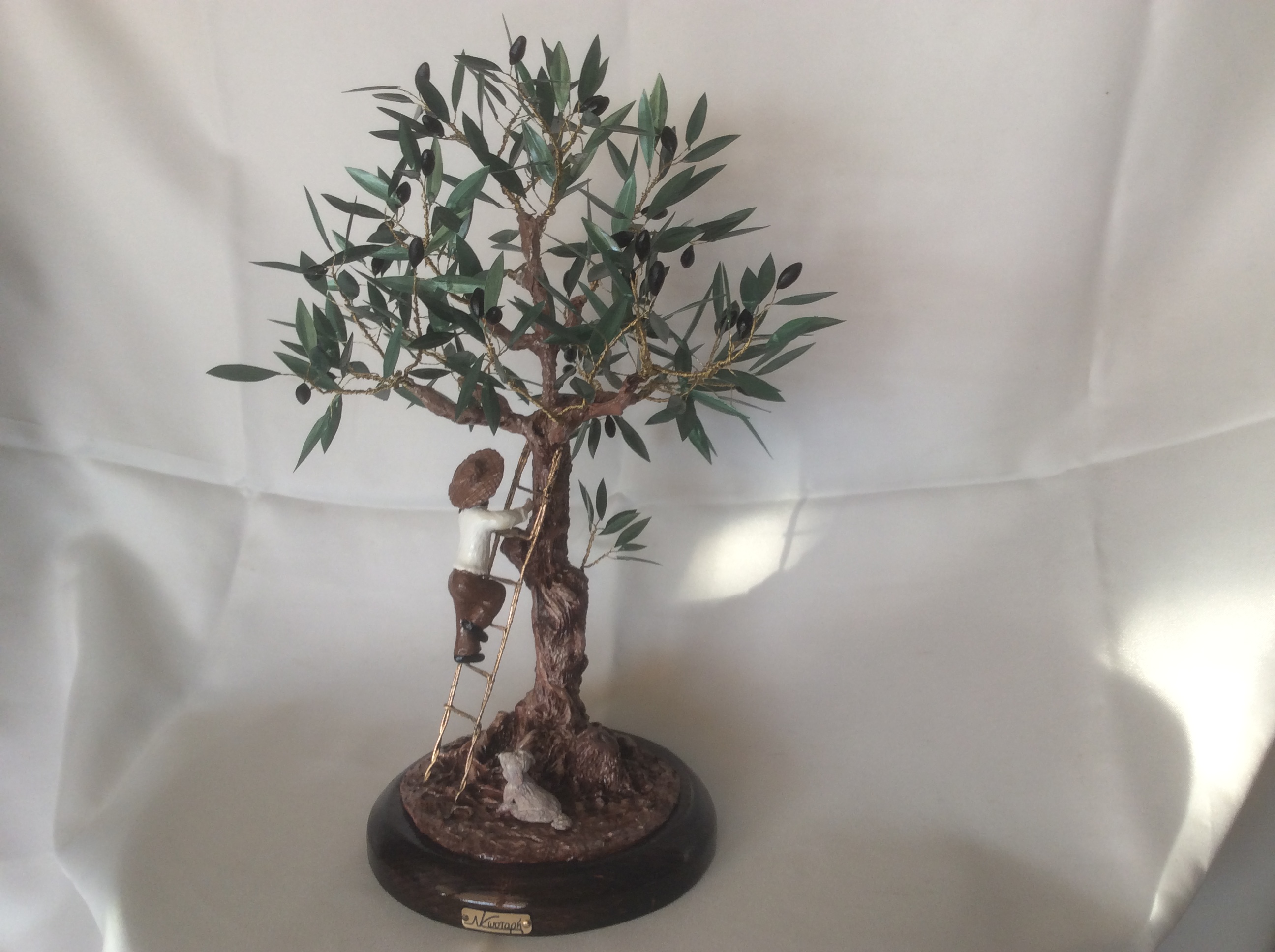 Μεγάλο διακοσμητικό δέντρο ελιάς με μαύρους καρπούς από πηλό. Η επισμάλτωση στα φύλλα από χαλκό δίνει φυσική όψη στην ελιά που στέκεται πάνω σε στρόγγυλη ξύλινη βάση. Ο κορμός είναι γλυπτός δουλεμένος με ιδιαίτερη φροντίδα στις λεπτομέρειες. Ο άντρας και ο σκύλος είναι επίσης γλυπτά με μεγάλη λεπτομέρεια. Η ειδική επεξεργασία των υλικών κάνει αυτή τη μοναδική δημιουργία αναλλοίωτη στο χρόνο και αποτελεί κλασσικό δώρο με διαχρονική αξία.